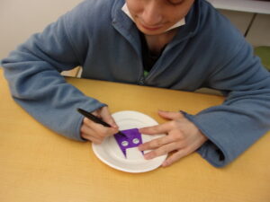 『口も書いてみよう!』と声を掛けるとひらがなで【くち】と書く場面もあり