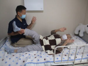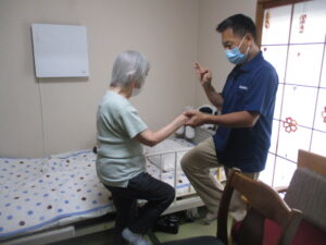 機能訓練。明るい雰囲気の中で楽しみながら取り組んで頂いております。